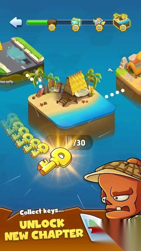 在地图界面中,点击带有10/30标识的箭头岛屿,消耗钥匙资源后,即可解锁新关卡、扩展防线,从而迎击更多僵尸。