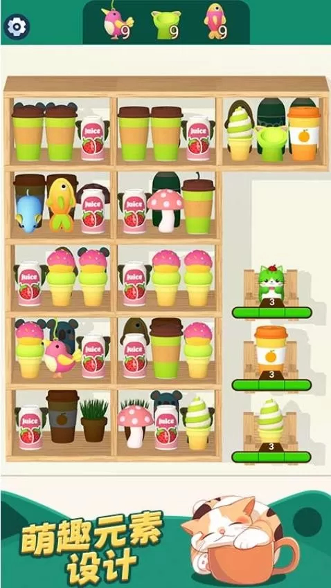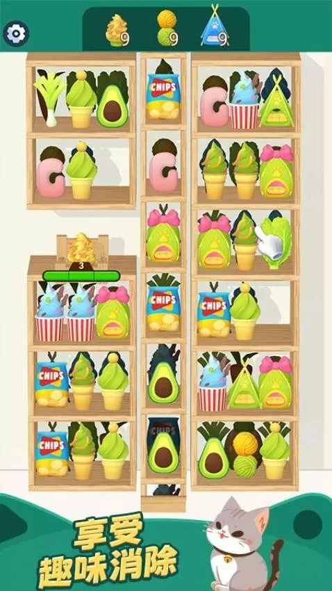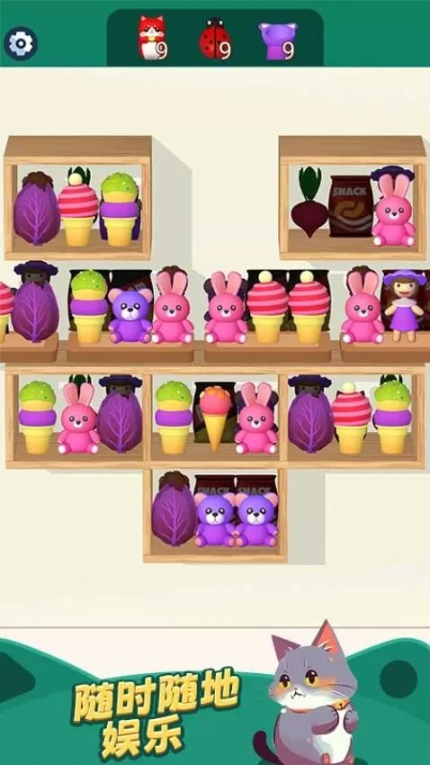 3、把三件相同的物品放置在同一个柜子里就能消除它们。当成功消除所有物品,您就能赢得游戏胜利。此外,游戏中为您准备了各类道具可供使用。随着关卡逐步解锁,您可以收集道具,借助它们更迅速地闯过难关。