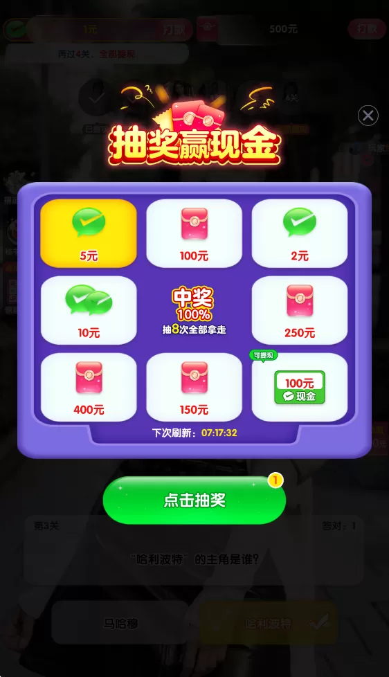 5、此外,在答题过程中还有几率触发转盘,触发后即可获得随机奖励。