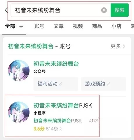 1、第一步,在微信小程序里搜索【初音未来缤纷舞台】,然后进入该小程序。