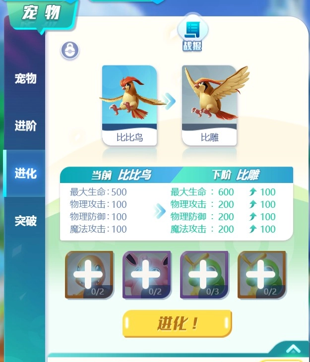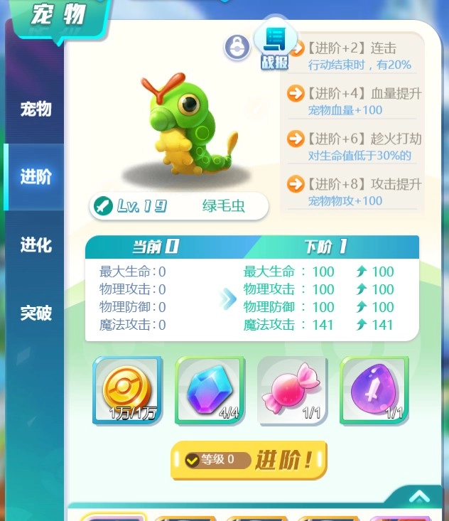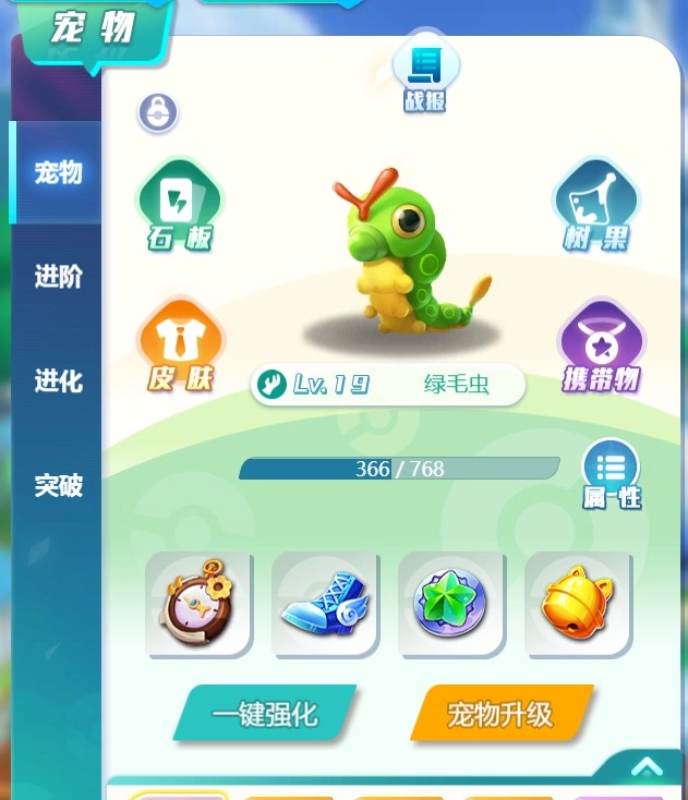 升级:通过消耗道具,可以对选中的宠物进行升级