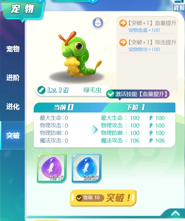 突破:突破能够激活并提升宠物的属性与技能加成效果。只要满足突破所需的条件,所有伙伴都可以通过消耗相应材料来完成突破操作。