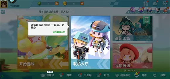1. 进入游戏大厅后,有四种游戏模式可供选择,分别是自建房间、联机玩法、迷你工坊以及我的家园。