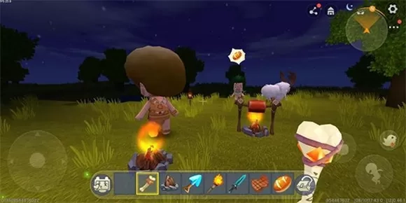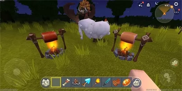 1、因为野人是在晚上的时候才会出现,所以我们先要等到晚上,然后将篝火放在地上,用火炬将篝火点燃,点燃篝火后在上面放上生肉进行烧烤。