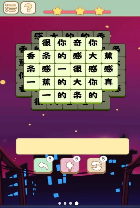 一款名为“一个大香蕉”的游戏,光听名字就透着股魔性劲儿。玩家的任务是把给出的字组合成当下热门的梗,而且都是大家熟悉的梗哦~这特别考验玩家的冲浪水平,看看你是不是5G冲浪达人。游戏操作简单,关卡设置丰富多样,难度还会逐步提升,玩起来特别上瘾,快来体验一下吧~