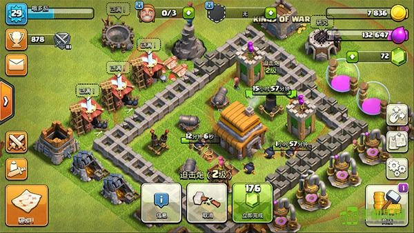 玩家每次进入游戏,都会默认出现在村庄地图里。在这个地图中,玩家可以建造大本营、城墙、兵营等各类建筑,以此生产更多资源,进而提升自身的军队实力。同时,玩家还能在村庄地图内查询自己的等级、货币、资源数量、建筑数量等信息,并且可以进行训练兵种、升级建筑等级、收集各类资源、布置资源与建筑物等操作。