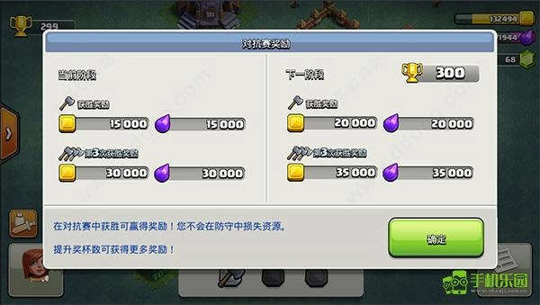 在对抗赛里,只有发起进攻的一方会损耗资源或兵种,防守方虽不会损失资源,却会失去一部分金币、圣水、暗黑重油等。玩家提高自己的奖杯数量,能够得到更丰厚的奖励。对抗赛与联机模式的奖杯数,是相互独立、分开计算的。