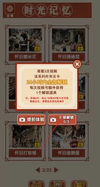 时光记忆是一款以找茬为玩法的游戏,十分考验玩家的眼力与观察力。该游戏主打怀旧主题,每一关都承载着80后的回忆。在复古的画面中,玩家要找出不属于那个时代的不和谐之处,将所有这类地方勾选出来,就算完成关卡挑战。玩家还能借助使用道具来延长时间或获取提醒帮助自己。每天,玩家通过观看视频,就能解锁所有关卡进行体验。