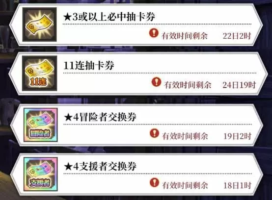 抽卡券总类包含了单抽、11连、交换券,抽卡券都是在抽卡里面抽的,需要滑动找到抽卡券抽卡(当然你得有抽卡券) 单抽包含:2星、3星、4星单抽券;11连包含:2星、3星、4星11连抽卡券;交换券:冒险者交换券、支援者交换券(稀有道具) 交换券可以在道具商店的冒险者交换所和支援者交换所两个地方交换,可交换的也就仅限于这里的角色,可兑换范围会随着版本卡池增加继续扩大(角色越来越多) 这里说一下,交换请谨慎,毕竟是稀有道具,请兑换对您队伍提升有更大帮助的角色。以下内容仅供参考 个人推荐的冒险者万精油(有了的就不要换!志愿者就不推荐了看自己需求):夏克提法尔玛、亚丝菲阿尔安朵美达、琉璃昂和鹿岛樱花这4个