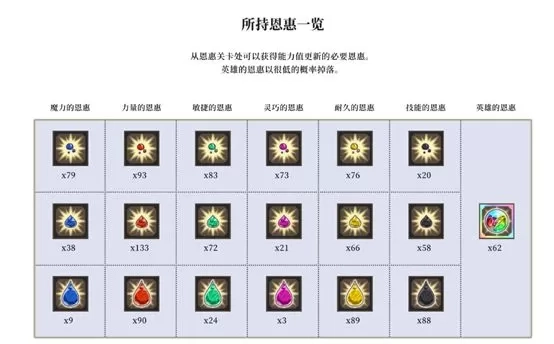 3、恩惠 恩惠分为属性恩惠和英雄恩惠 单色的就是属性恩惠,用来解锁对应属性,英雄恩惠则是在特殊的解锁时使用 在刷恩惠关卡时会有一定概率掉落英雄恩惠,恩惠关卡可以使用英雄恩惠钥匙来提高恩惠关卡掉落英雄恩惠的获得率,适用于所有难度,每周星期二可以获得一个