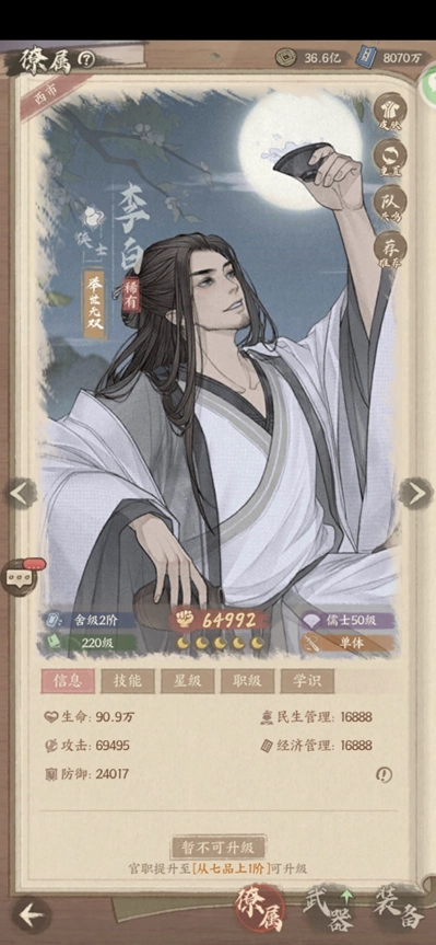 这边以李白为例,我们可以通过升级、升星、提升技能等级、职级等级、学识等级,以及搭配武器和装备等方式来强化角色。等级和职级尽量拉满,通常不会有太大问题。武器和装备方面,优先提升主C和前排的两个肉盾。对于平民和微氪玩家而言,提升技能性价比很高,能带来显著的战力提升。