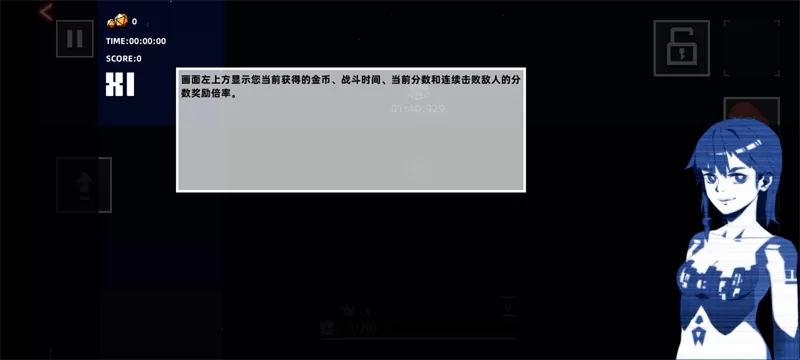 6、在画面的左上方,会展示出您当前所获得的金币数量、战斗已经持续的时间、当前的分数,以及连续击败敌人所获得的分数奖励倍率。