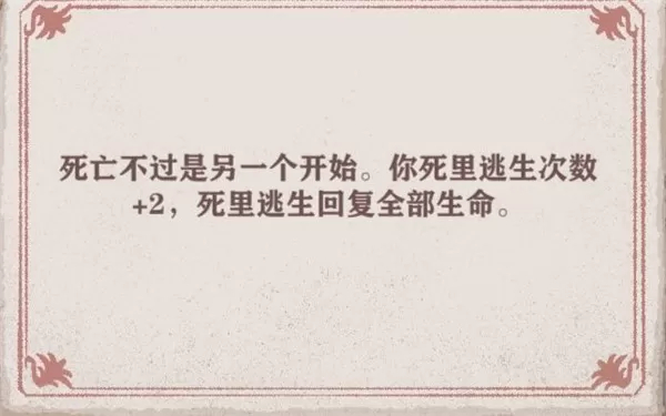 通常不建议使用该天赋。确实,死里逃生是高难度关卡中难以避开的工具,但依靠大量逃生堆积而通关,恰恰证明了自身数据(涵盖面板、天赋、技能、遗物)存在欠缺。也就是说,只有那些不擅长搭配面板、天赋、技能与遗物,且无法通关(通俗讲就是水平欠佳)的玩家,才会推荐选用这个天赋。一般情况下,这个天赋的强度并不高,因为携带此天赋意味着在平常回合中仅有两个天赋可用,这对发育节奏会产生严重影响。最终,面板、技能以及遗物方面的差距,已然超过了死亡回归所带来的收益。