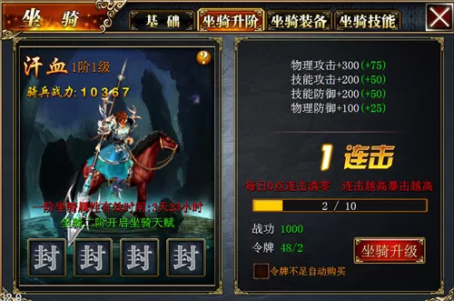 坐骑可以升阶,每点一次坐骑升阶会消耗一定数量的令牌和战功,为当前坐骑进阶进度加一定进度每点一次坐骑升阶按钮算一次连击,连击数越高,进度增长越快,每日0点连击数清零。令牌可以从新开功能一骑当千中获得。