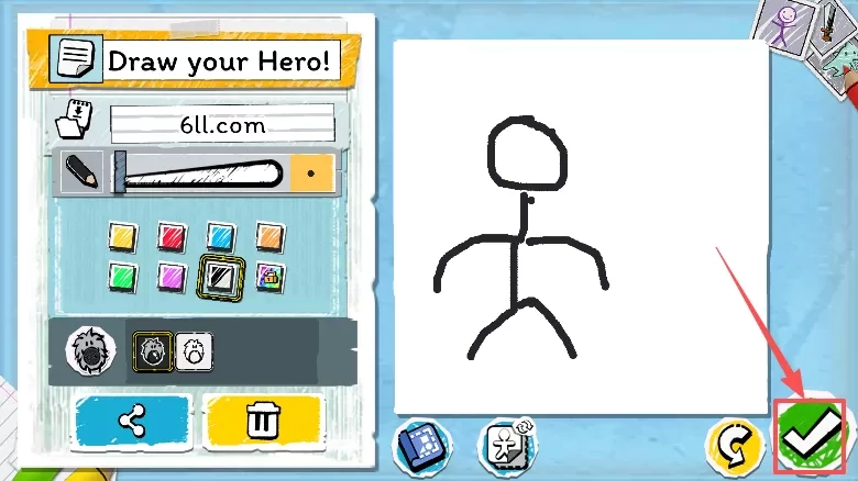 1、当进入游戏后,第一步需借助画笔绘制出你的英雄,在界面左侧能够对画笔的颜色、粗细等细节进行调整。