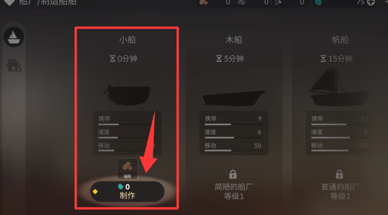 进入船厂后点击制作第一个小船。