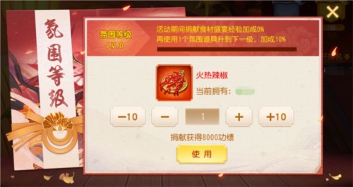 饕餮盛宴的热闹氛围必不可少,小乔作为气氛担当必须全程在线。氛围道具能助力主公的盛宴等级更上一层楼,主公捐献[火热辣椒]可提升氛围等级,捐献野生香菇、雪花肥牛还能获得经验加成,最高能达到50%!10级轻松达成,快和小伙伴们一起参与吧。