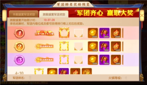 本服军团盛宴等级排名前三的军团,可代表本服参与跨服盛宴,其对应的盛宴等级将延续至跨服盛宴。在跨服盛宴期间,主公向其他军团捐献资源,不会提升该军团的盛宴经验,仅能获取个人功绩。