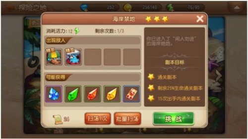 探险之地属于个人PvE副本,每次挑战成功都能获取经验、金币与道具奖励,同时还能顺便完成各类任务。当活力充足时,可进行副本扫荡,以此快速获得大量经验。