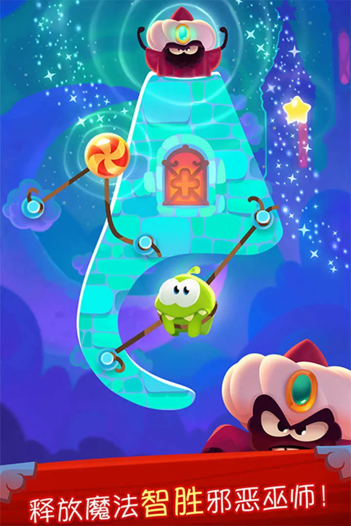 最后,当boss的法术停歇时,割断糖果的绳子,糖果就会被抛到右下角。别担心,紧接着boss会再次施展法术,届时糖果便会成功被吸到主角嘴里。第九关通关攻略: