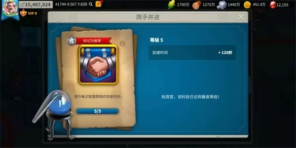 携手并进:提高联盟帮助的最少加速时间,点满这个技能后,联盟最少的帮助时间一次为3分钟。在前期,许多东西升级所需要的时间很短,甚至很多情况下只需要帮助被点满,你的建筑或者科技就升级完了,这可以大大提高联盟成员的发育速度。