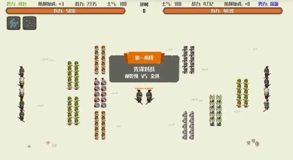 可选的阵型有:方冲阵、锋矢阵、雁行阵、四门阵、城甲阵。完成配置后即可进入主战场。