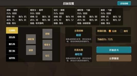战斗前可在设置界面调整阵型、出战将领、主帅与先锋。设定完成后点击开始战斗。
