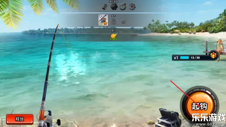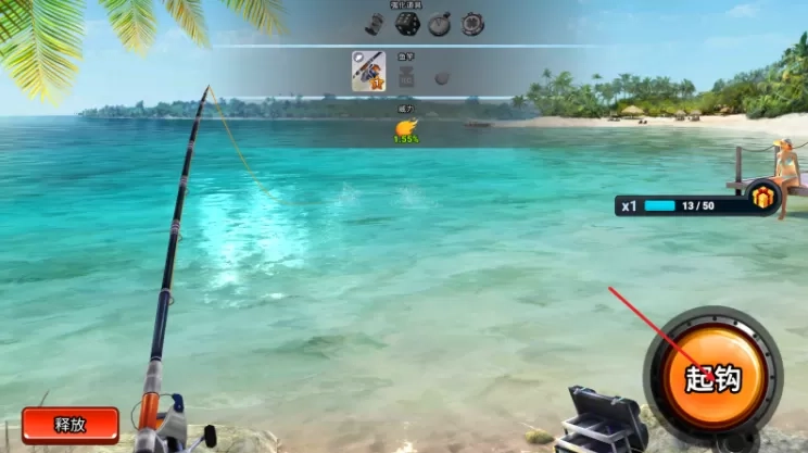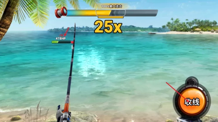3、鱼儿上钩之后,我们需要不断的点击收线来削减鱼儿血量。