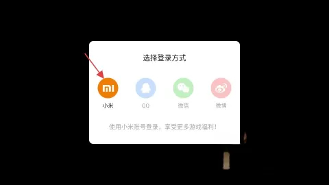 2、随后,在登录方式选择界面,按照箭头的指示,点击【小米】图标,即可通过小米账号实现快速登录。