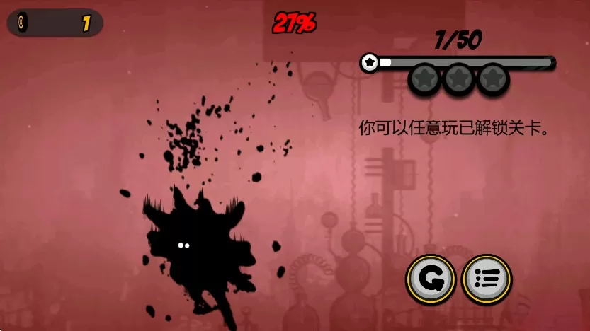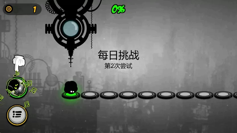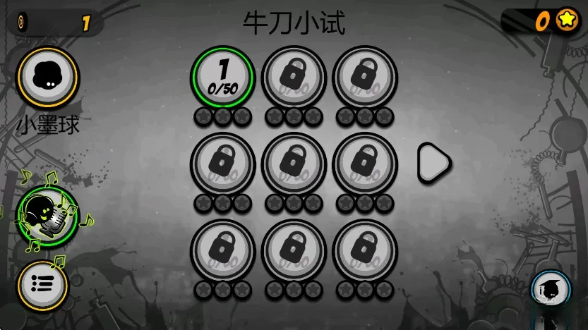 2. 点击“开始”后,会打开关卡页面。在此页面上,玩家能够切换墨点角色,并且点击左侧的音乐按钮。