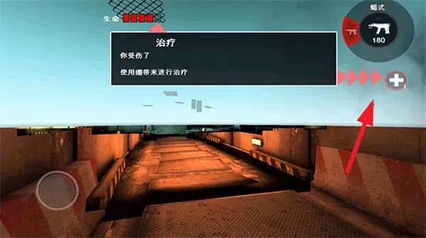 2、一旦受伤血量就会降低,记得使用右上角的“+”功能,就能使用绷带回血的。