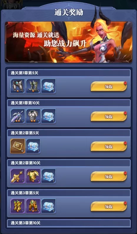 过完新手任务后,继续冲击主线关卡和野外的异界探险副本,打到打不动时领取通关奖励获得大量高级召唤道具,抽完这些道具获得的英雄进行升星升级操作,然后回头继续重复挑战领奖操作。当关卡和异界探险都打不动后,可以关注成长任务,清空成长任务目标也能获得超多高级召唤道具。