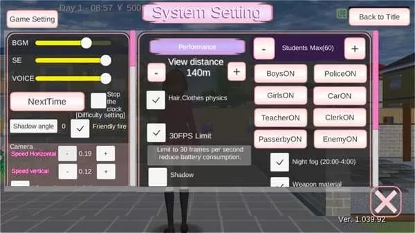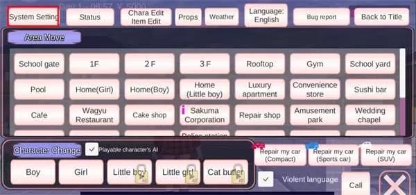 四、樱花校园模拟器如何调整时间 1、进入游戏后,点击游戏界面左上角的菜单选项,打开后能看到诸多功能选项,点击菜单选项中的【System Settings】进入系统设置界面。