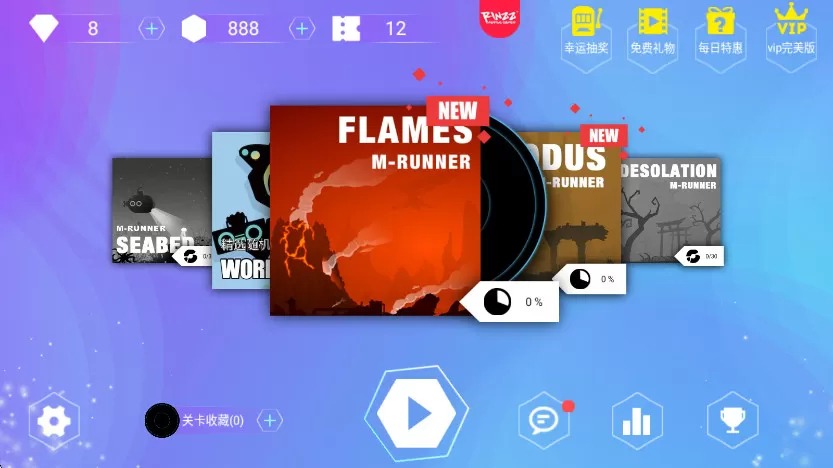 1. 玩家打开游戏后,点击屏幕即可进入系统主页面。其中,关卡分为解锁与未解锁两种状态,未解锁的关卡需有关卡碎片方可体验。玩家选好已解锁的关卡后,点击下方按钮,就能进入下一步操作。