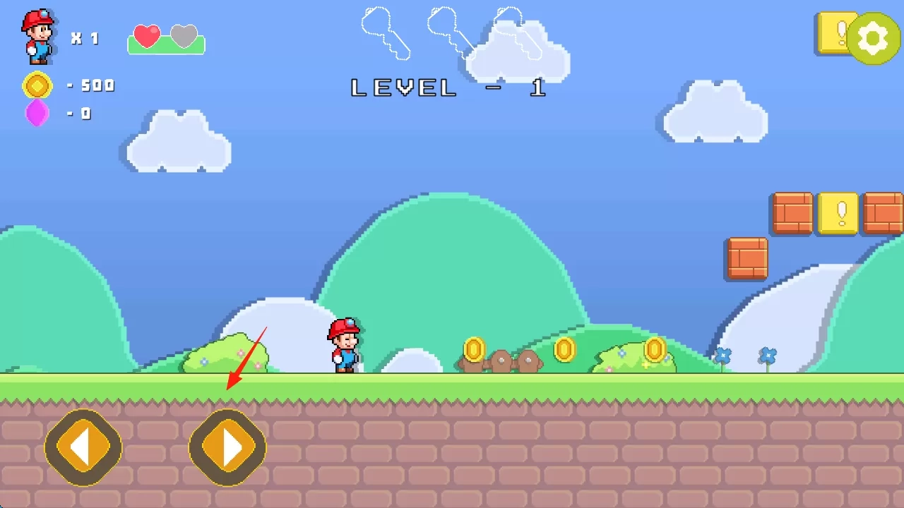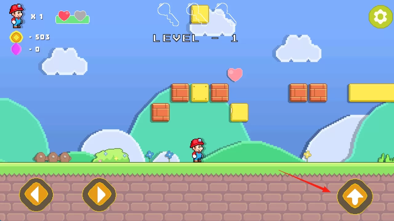 3、靠近砖块区域(红箭头所指处),长按跳跃键,顶碎带有问号的砖块,从而获取奖励(爱心金币),接着跨越障碍,推动关卡进程。