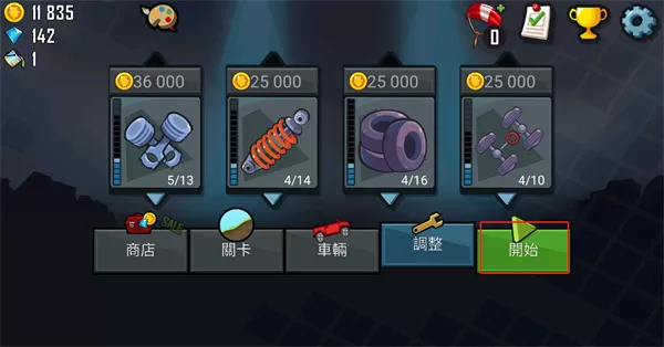 3、升级部件包括发动机、悬浮、轮胎和四轮驱动