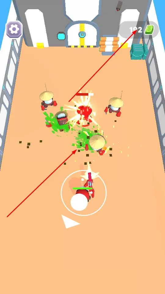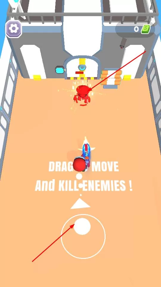 1、主界面通过拖动底部虚拟摇杆DRAG TO MOVE,操控角色移动,瞄准并攻击前方红色敌人,正式进入关卡战斗。
