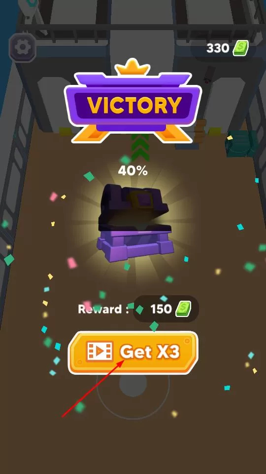 3、取得胜利后,会弹出VICTORY结算界面,玩家可获得150金币奖励。若点击“Get X3”并观看广告,就能让收益翻倍,所积累的金币可用于强化。