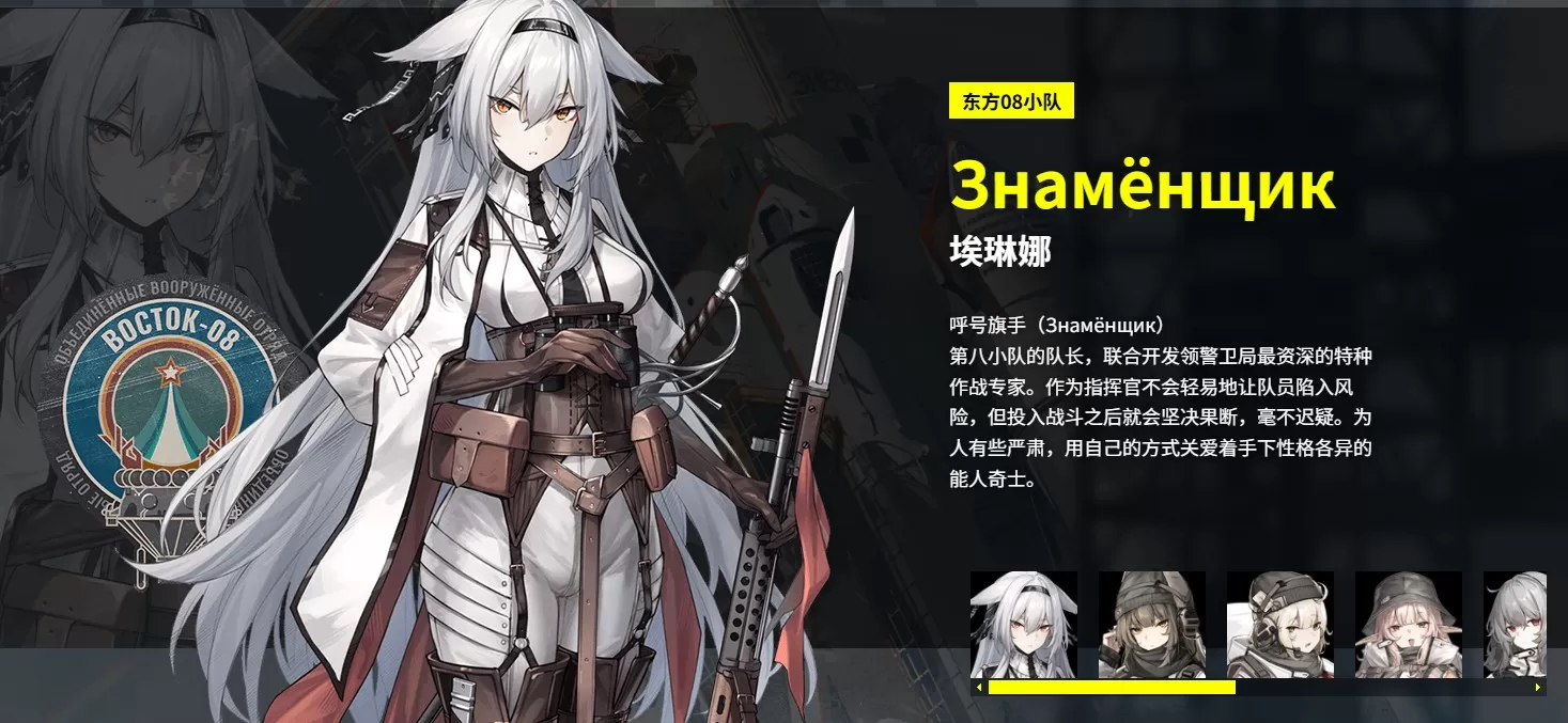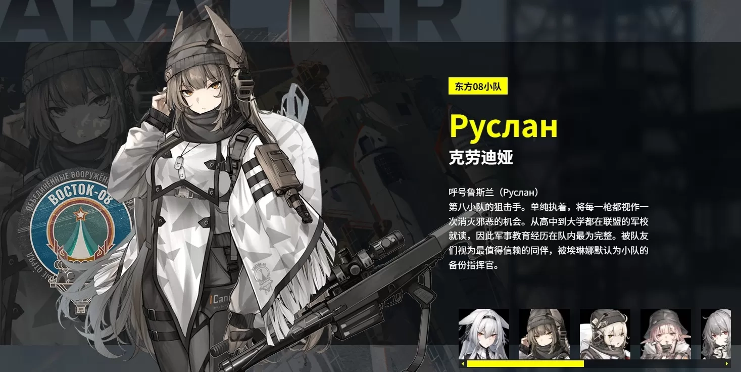 呼号鲁斯兰第八小队的狙击手。单纯执着,将每一枪都视作一次消灭邪恶的机会。从高中到大学都在联盟的军校就读,因此军事教育经历在队内最为完整。被队友们视为最值得信赖的同伴,被埃琳娜默认为小队的备份指挥官。
