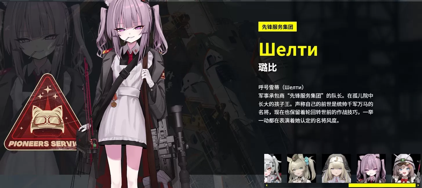 呼号雪蒂军事承包商“先锋服务集团”的队长。在孤儿院中长大的孩子王。声称自己的前世是统帅千军万马的名将,现在也保留着轮回转世前的作战技巧,一举一动都在表演着她认定的名将风度。