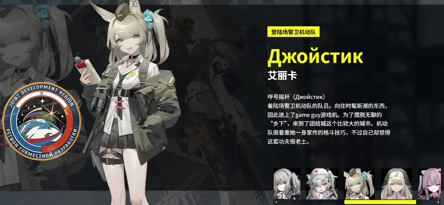 呼号摇杆着陆场警卫机动队的队员。向往时髦新潮的东西,因此迷上了game guy游戏机。为了摆脱无聊的“乡下”,来到了团结城这个比较大的城市。机动队很看重她一身家传的格斗技巧,不过自己却觉得这套功夫很老土。