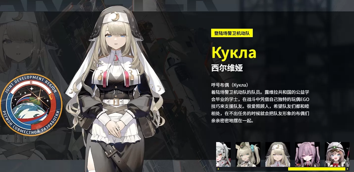 呼号布偶着陆场警卫机动队的队员。露维拉共和国的公益学会毕业的学士,在战斗中凭借自己独特的玩偶EGO技巧来支援队友。很爱照顾人,希望队友们都和睦相处,在不出任务的时候就会把队友形象的布偶们亲亲密密地摆在一起。