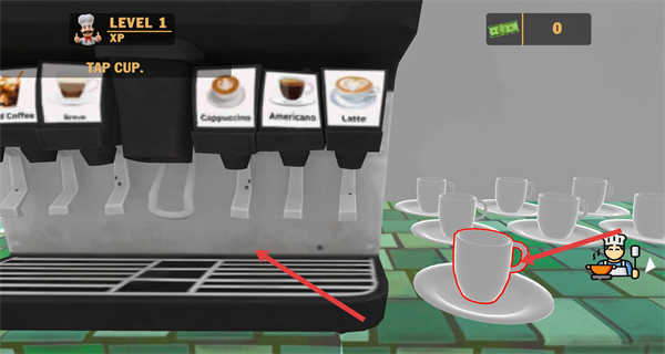3、来到咖啡机旁点击空杯,选择对应咖啡如卡布奇诺启动制作,留意上方咖啡种类精准完成饮品准备。
