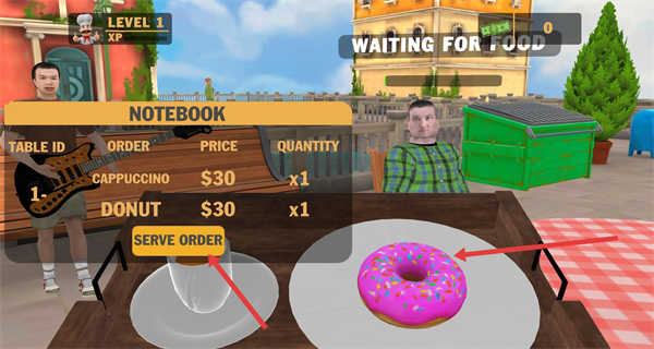 4、查看订单卡布奇诺甜甜圈,确认食物就绪后,点击SERVE ORDER按钮将餐品递送给顾客完成关卡任务。