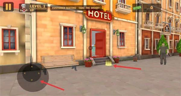 2、进入场景后通过左下角虚拟摇杆操控角色移动,靠近酒店前的顾客接收订单提示开启服务流程。