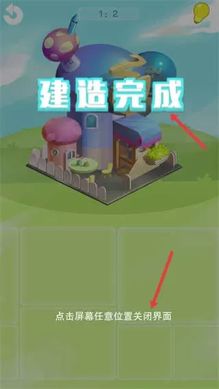 4、当建筑及装饰都布置好后会显示建造完成,此时点击屏幕任意位置可关闭建造完成界面,回到主场景继续游戏。