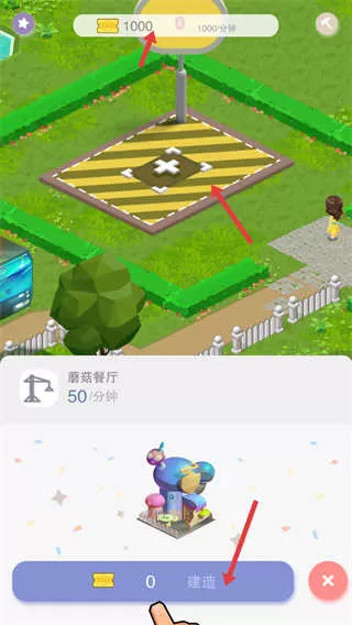 2、选择要建造的建筑如蘑菇餐厅,确认拥有足够资源后,点击建造按钮即可开始建筑的搭建,等待建造完成。