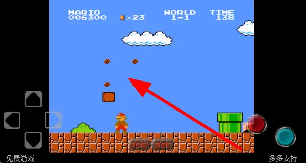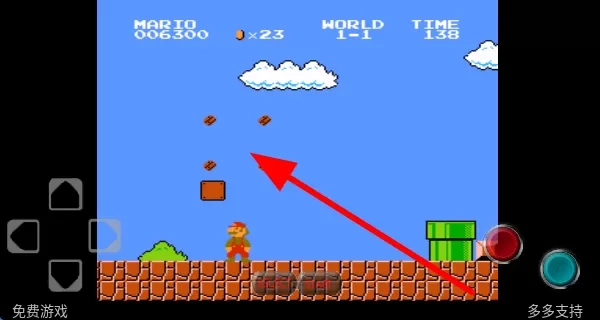 1、操控马里奥移动,跳跃顶碎砖块获取隐藏道具或金币,这些道具能助力闯关,金币可积累分数,让游戏更有趣。