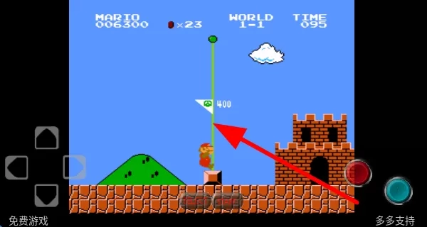 2、遇到绿色旗杆,操控马里奥跳跃触碰,会获得分数奖励,还能朝着关卡终点推进,完成当前关卡。