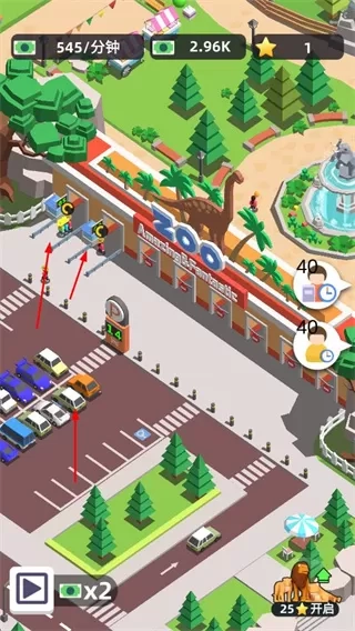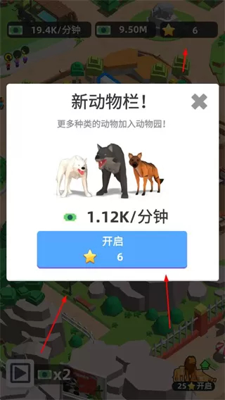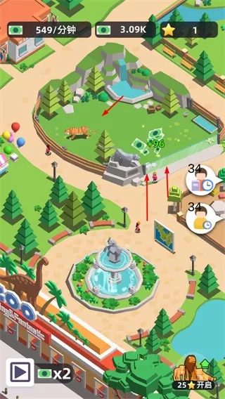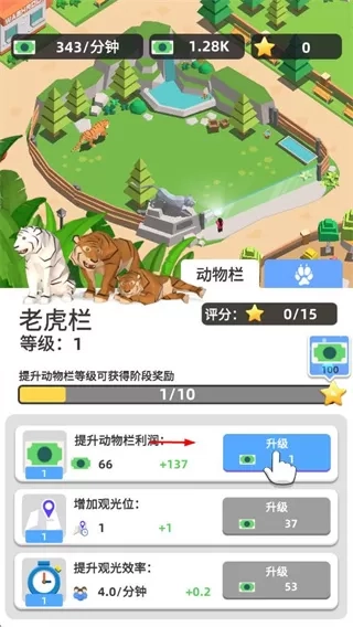 1发展动物园的关键操作之一,是点击动物栏处的升级按钮,借此提升动物栏等级,进而增加盈利与观光值。